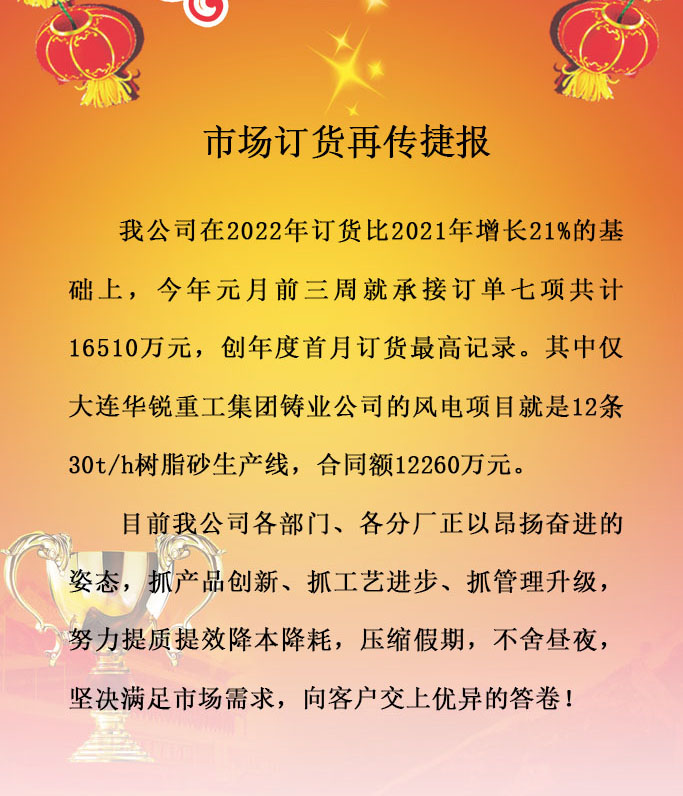 【概要描述】我公司在2022年訂貨比2021年增長21%的基礎上,今年元月前三周就承接訂單七項共計16510萬元,創(chuàng)年度首月訂貨最高記錄。其中僅大連華銳重工集團鑄業(yè)公司的風電項目就是12條30t/h樹脂砂生產(chǎn)線,合同額12260萬元。